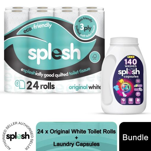 Splesh Quilted Luxury White 3 Ply Soft Toilet Tissue Paper 24 Rolls + Splesh Xtra Stain Removal 3 in 1 Laundry Capsules, 5 Months Supply Bulk Buy 140 Washes