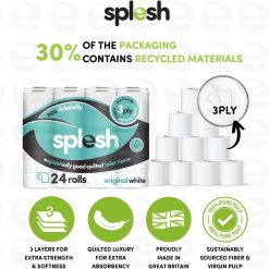 Splesh Quilted Luxury White 3 Ply Soft Toilet Tissue Paper 24 Rolls: This toilet roll bulk buy contains a pack of 24 quilted luxury white 3-ply toilet rolls. These luxury toilet rolls come with a touch of scented luxury. The toilet paper is created with micro-impressions and quilted for a touch of luxury. The 3-ply toilet tissue paper is made with a touch of cotton so it is ultra-soft and gentle, feeling smooth against your skin. With the promise of 3 layers (approx. sheet size: 105mm x 115mm), Splesh was designed to not only be stronger and more durable but provide maximum absorption.