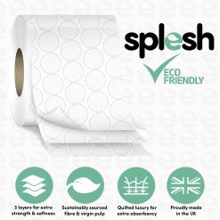 Splesh is thicker and stronger than Cusheen, our 3-Ply toilet rolls are made from 3 layers of super-soft white tissue paper. Each loo roll is luxuriously quilted and embossed to ensure comfort, and strength and provide maximum absorption.